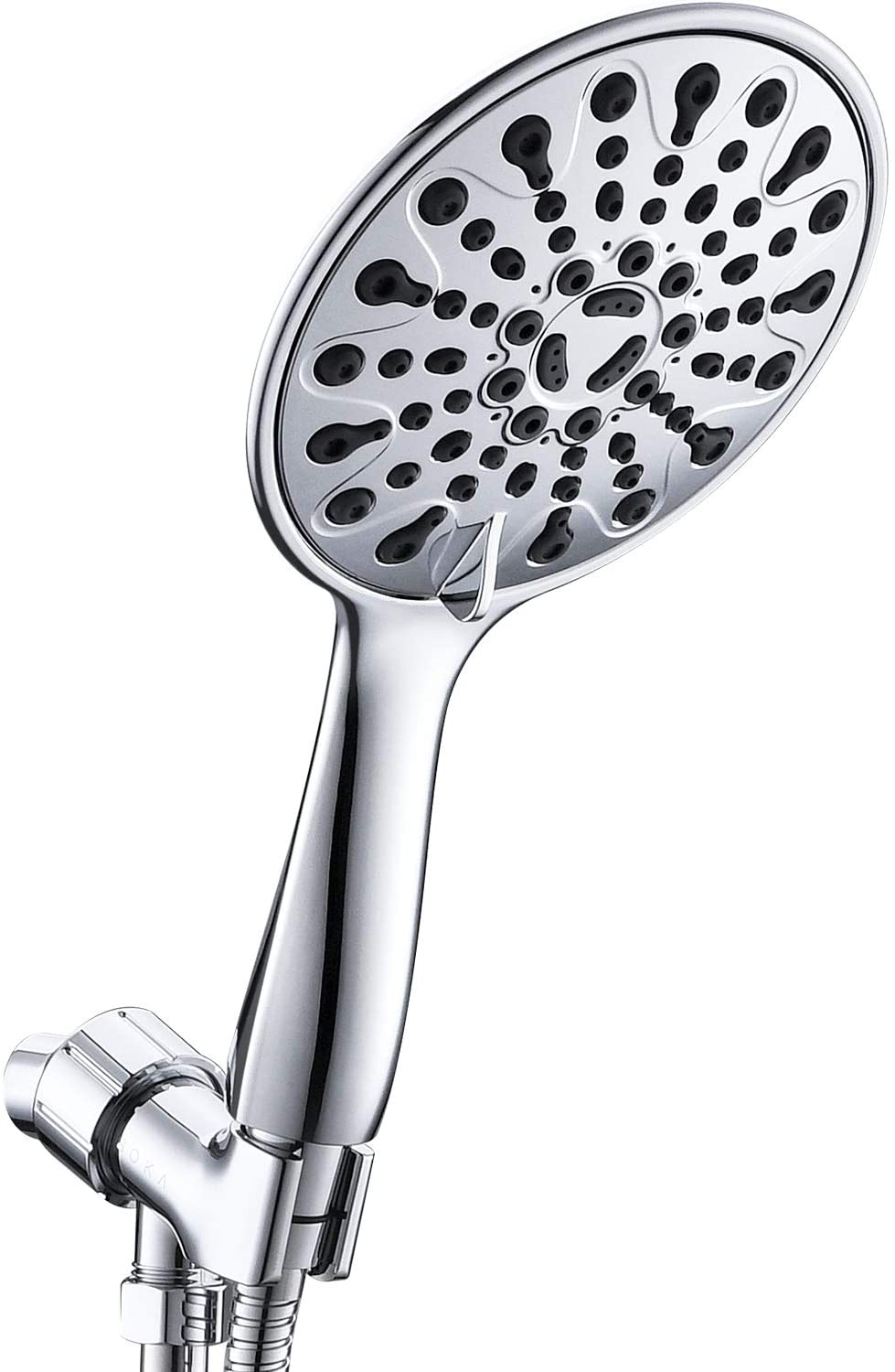 - HIGH-QUALITY MATERIALS: The shower head body and bracket mount are made with the highest quality chrome plated ABS materials, sturdy and durable, no toxic or lead. The TPR soft silicone nozzle prevents mineral accumulation and is easy to remove with your fingers. Stainless Steel Hose makes the high-pressure shower headset light, high strength, and no rusting or fading.